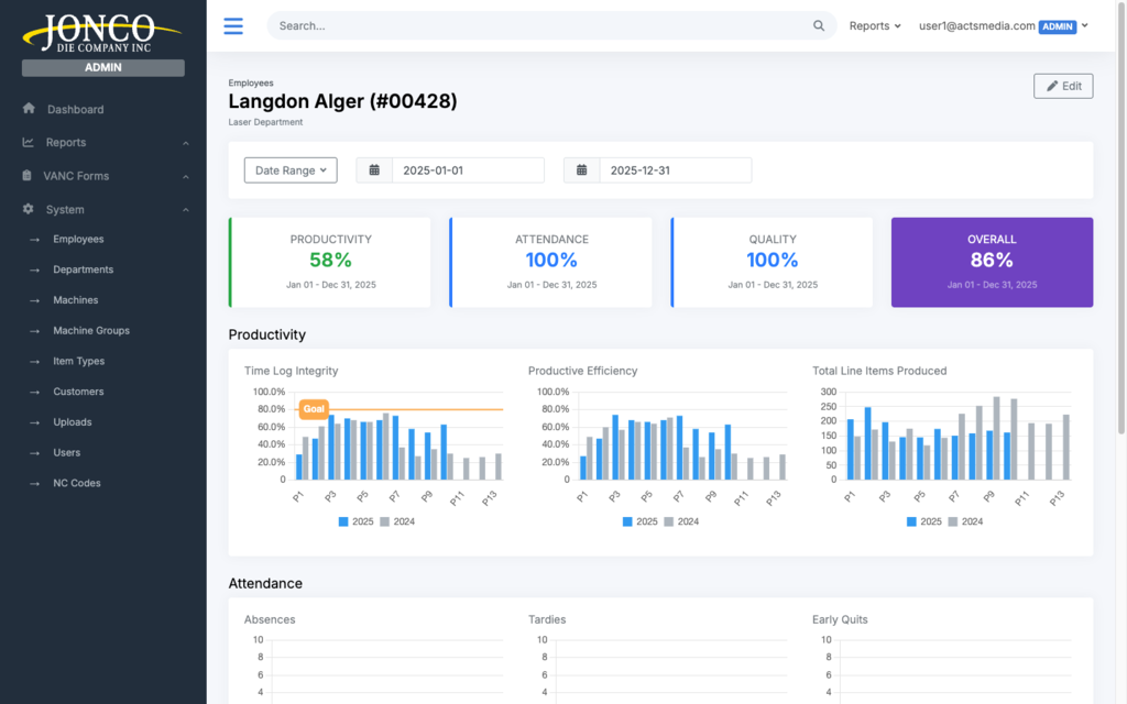 By developing a custom data and analytics dashboard for Jonco Die Company, Acts Media provided the company with a powerful tool to track employee performance, improve operational efficiency, and make informed decisions based on real-time and historical data. The dashboard's customizable features, real-time tracking capabilities, and department-level insights have significantly improved Jonco Die Company's ability to monitor and optimize its workforce, leading to greater productivity and overall business success. This project demonstrates how a tailored data solution can drive performance improvements and provide actionable insights in a manufacturing environment.